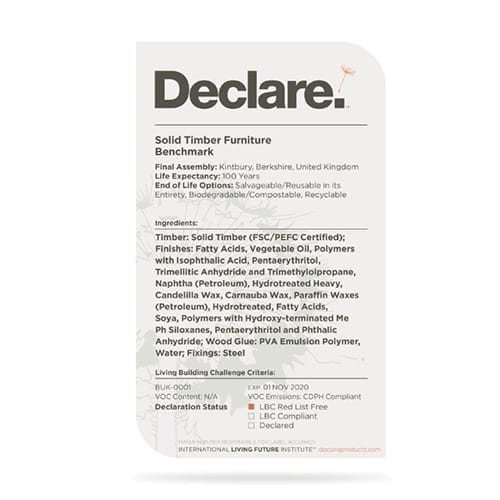 Our furniture has Red List Free Declare Labelling – an internationally recognised ingredients list for products that shows where it comes from, what it is made of and where it goes at the end of its life. Red List Free means that our furniture is free of harmful toxic chemicals and meets the standards for WELL certified buildings.